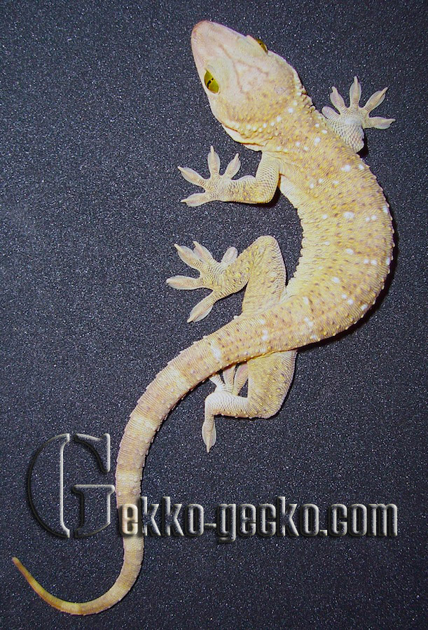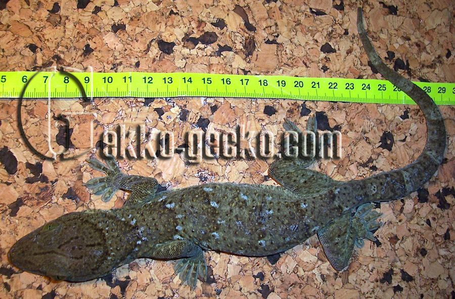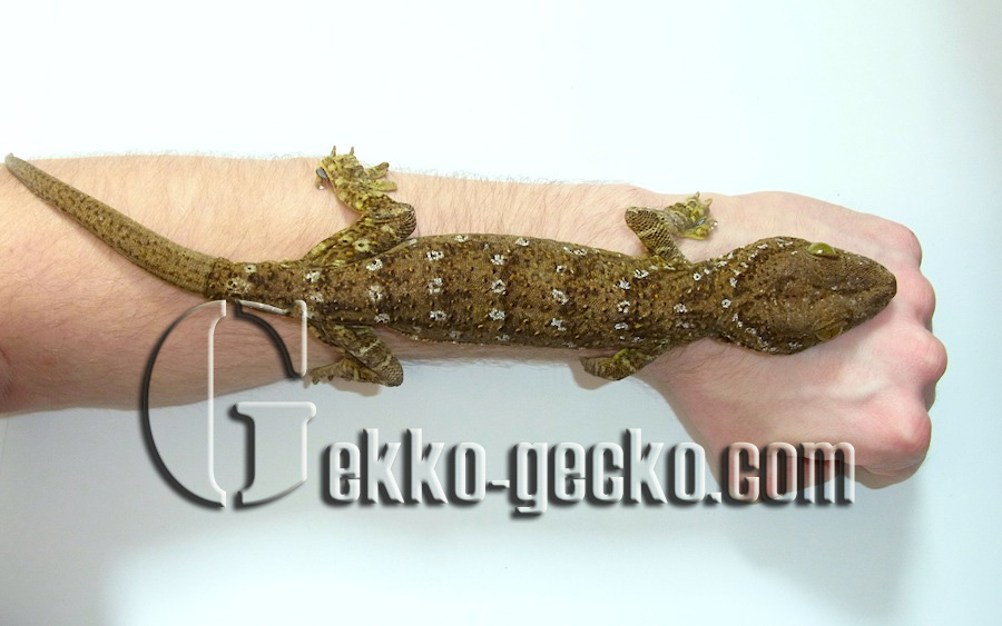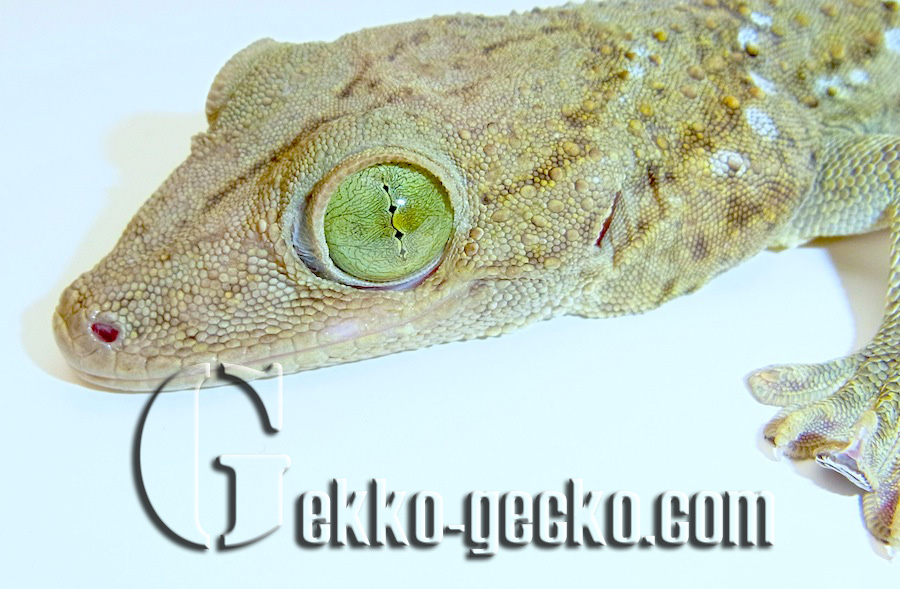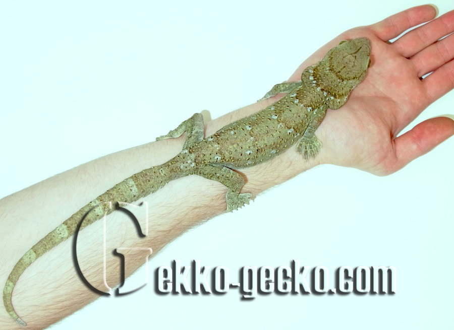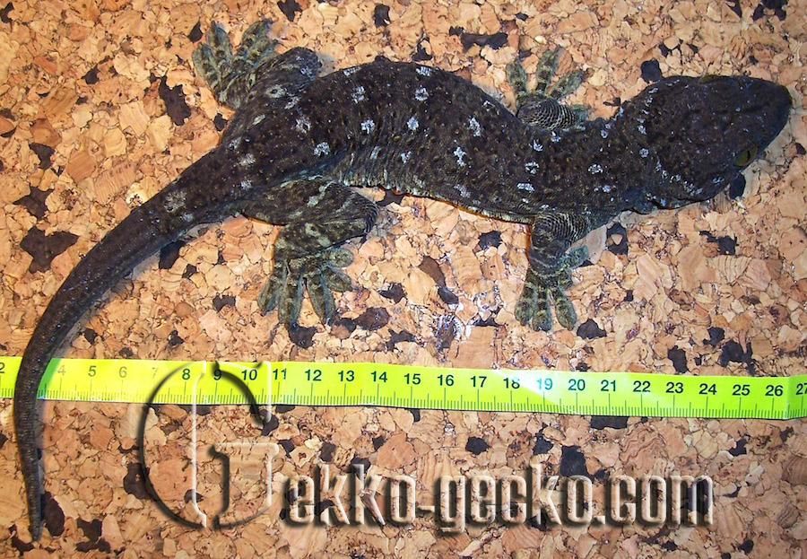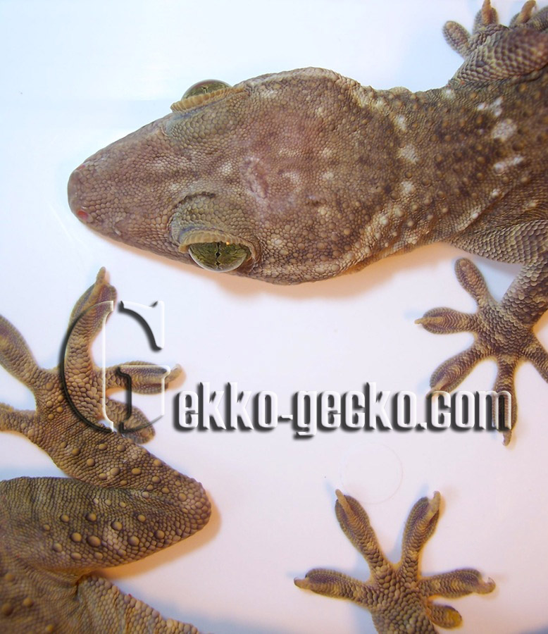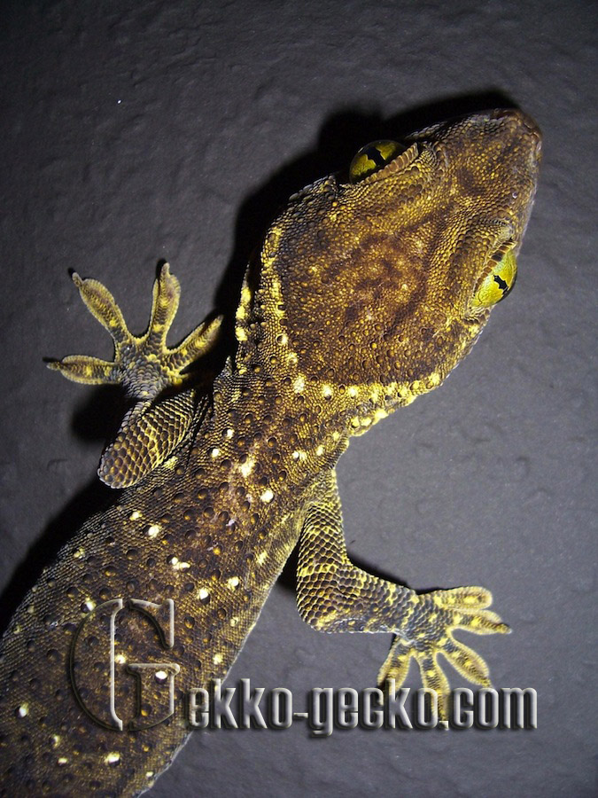 Description Males grow to a SVL of 191 mm and a tL of 376 mm; females are smaller. Although this renders them longer than the Tokay gecko, they are not as massive or heavy as these and always appear more slender. The entire upper face is covered with small scales amongst which there are 10-12 regular rows of tubercles on the back. The large, hexagonal ventral scales are arranged in 29-39 rows between the ventrolateral skin folds. Sexually mature males sport an angular row of 7-17 preanal pores. The fingers and toes of the muscular limbs are much widened, and except for the innermost ones, are furnished with claws, as is characteristic in this genus; the entire lamellae provide safe purchase for climbing. The dorsal ground colour ranges from yellowish green through olive to dark greyish green with a relatively darker spotted pattern. There are usually 8 bands of whitish to yellowish spots between the nape of the neck and the base of the tail. The top of the head exhibits a dark Y-shaped marking. The mucous membrane of the mouth is reddish. The eyes are striking in that the areas around the slit-shaped pupil are emerald-green in colour. The limbs carry narrow, the original tail wide bands in a lighter shading. The underside is whitish, beige or yellow, either nearly uniform or densely spotted with greyish green. Juveniles are deeply blackish olive in colour, with a contrasting pattern of white bands on the body, limbs and tail (GROSSMANN 2006). The Siamese Green-eyed Gecko (Gekko siamensis) from central Thailand is easily distinguished from G. smithii by its smaller adult size, the absence of the Y-shaped marking on the head, and the darker, umber-green eye colour (GROSSMANN & ULBER 1990).