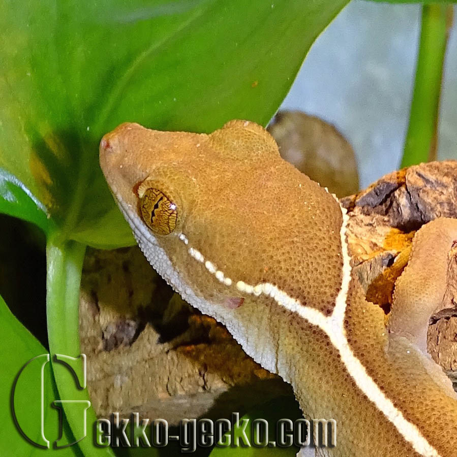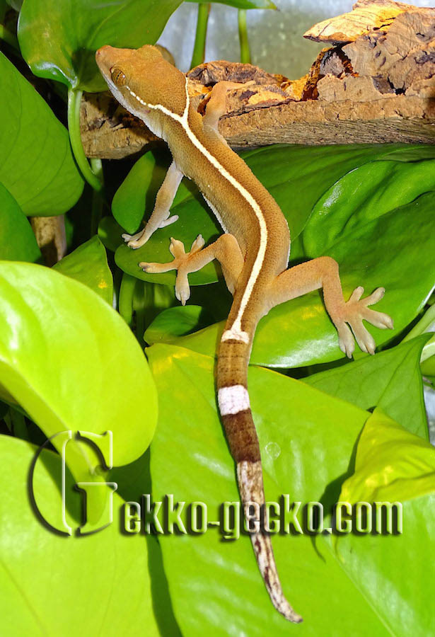 Description: G. vittatus is a slim representative of the genus Gekko. It grows to a total length of up to 30 cm, of which the tail accounts for a little more than half. Many fully-grown specimens will not exceed about 25 cm in total length, though. Its slender body and narrow head accentuate the long limbs and the let the fingers and toes stand out in particular. A characteristic and prominent trait is the white line that runs from the base of the tail to the rear of the head where it will split and continue to the eyes on both sides. This stripe accounts for the gecko’s vernacular name. The original tail carries white cross bands instead. Regenerated tails lack this banded pattern. The dorsal ground colour is usually a yellowish shade of brown, but greenish yellow, reddish brown, or dark brown specimens are known. Animals with twinned longitudinal stripes, only one very weakly expressed stripe, or with no stripe at all have also been noted.